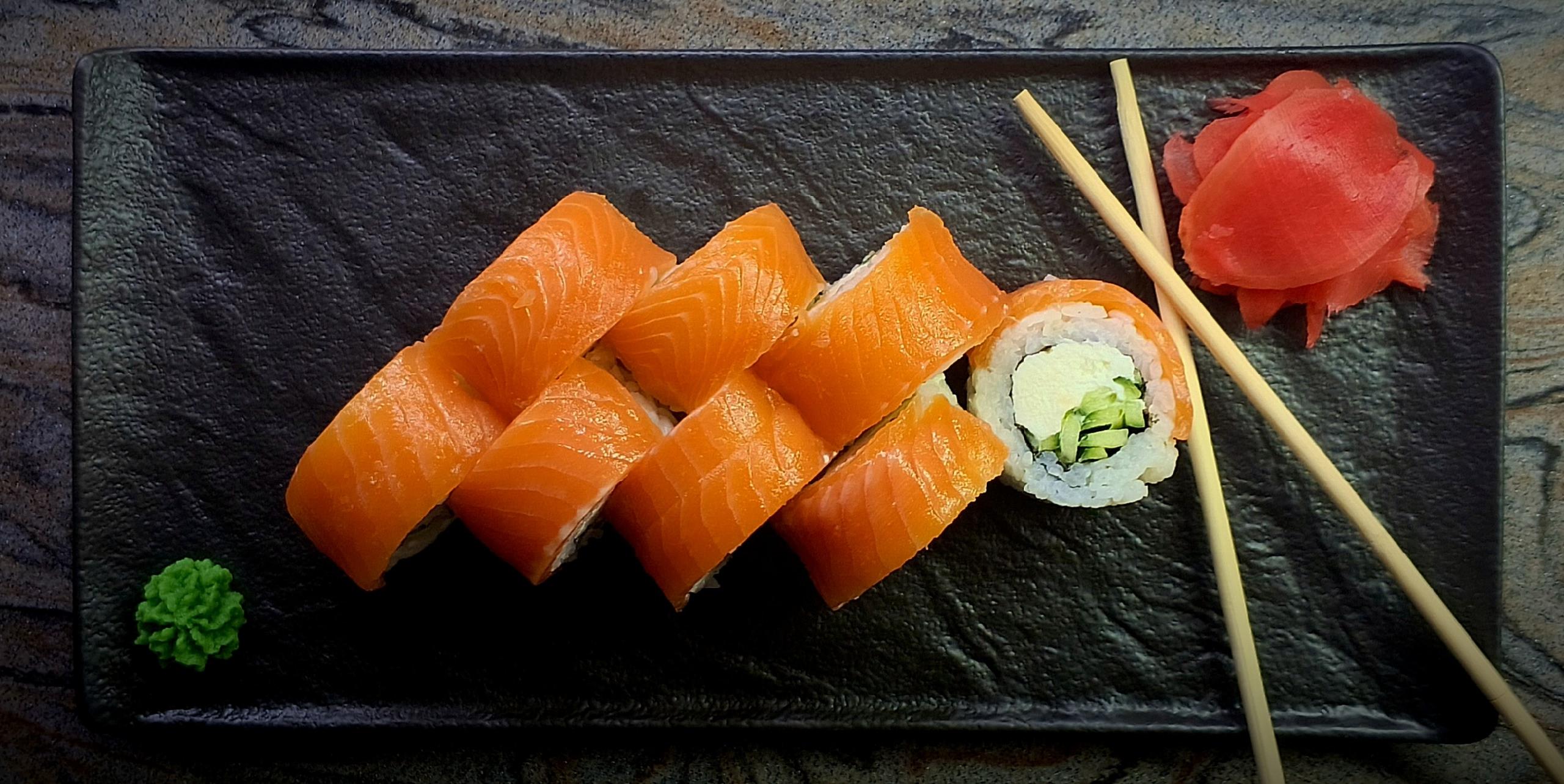 Состав: рис, нори, творожный сыр, лосось, огурец. ≈310гр.