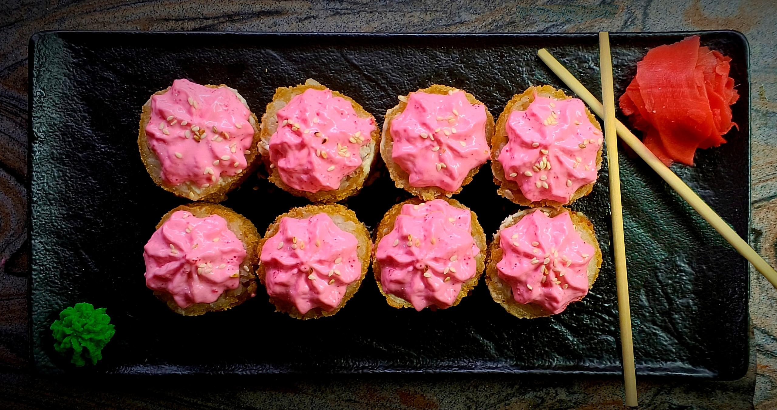Состав: рис, нори, творожный сыр, креветка, панировочные сухари, соус "Яки", кунжут. ≈350гр.