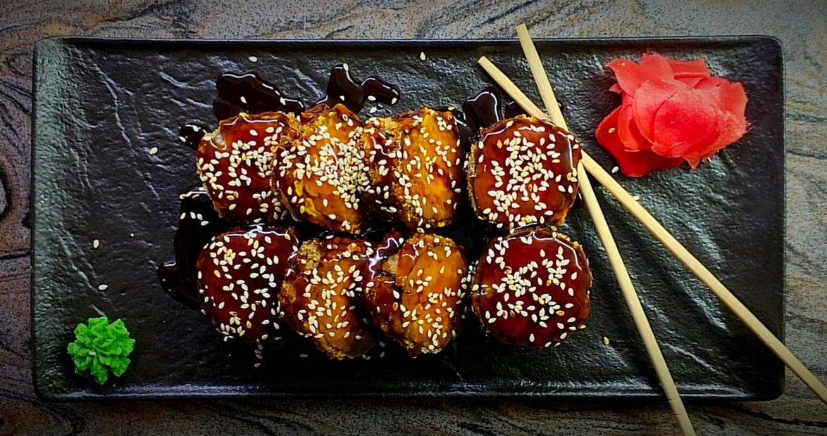 Состав: рис, нори, творожный сыр, соус "Унаги", кунжут. ≈330гр.