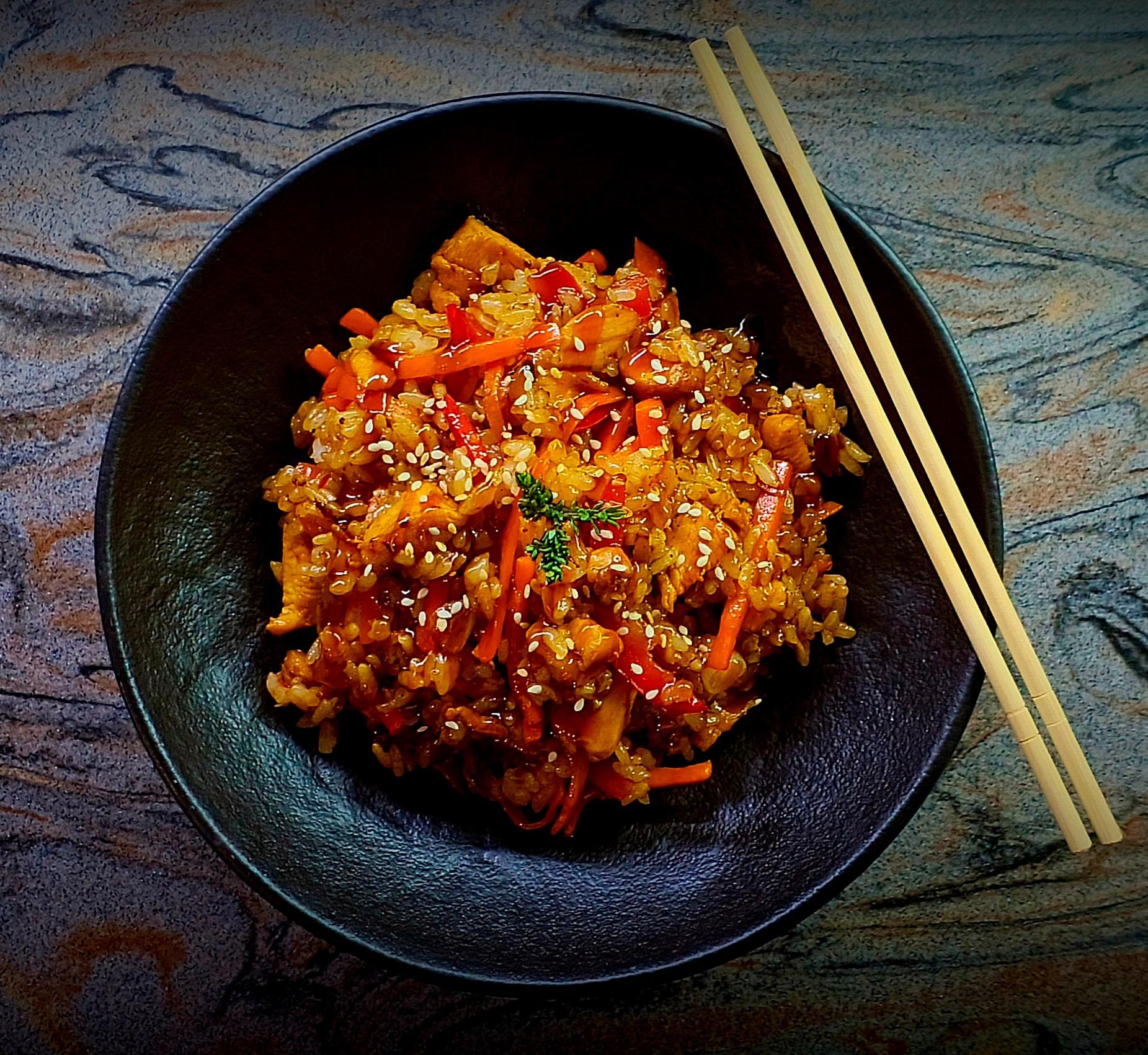 ≈450гр. Состав: рис, курица, морковь, болгарский перец, чеснок, соус "Терияки",соус "Соевый", соус "Унаги", кунжут.