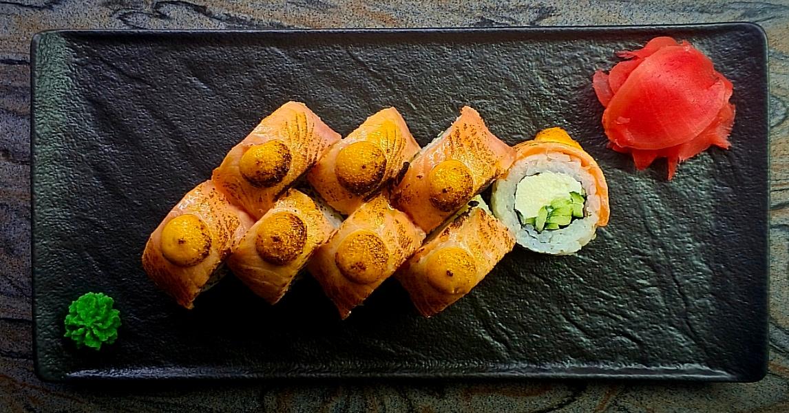 Состав: рис, нори, творожный сыр, лосось, огурец, соус "Спайси". ≈330гр.