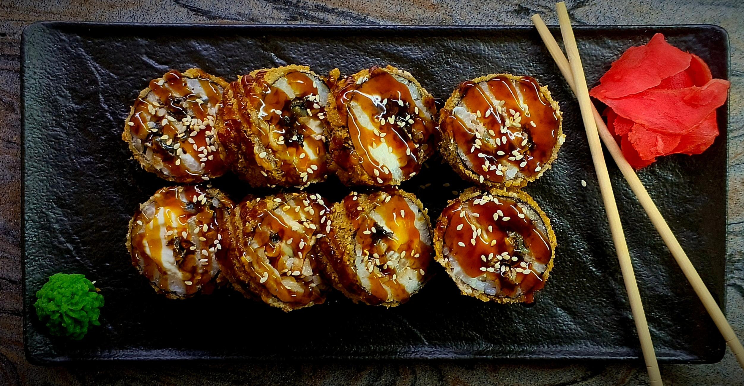 ≈310гр. Состав: рис, нори, творожный сыр, угорь, панировочные сухари, соус "Унаги", кунжут.